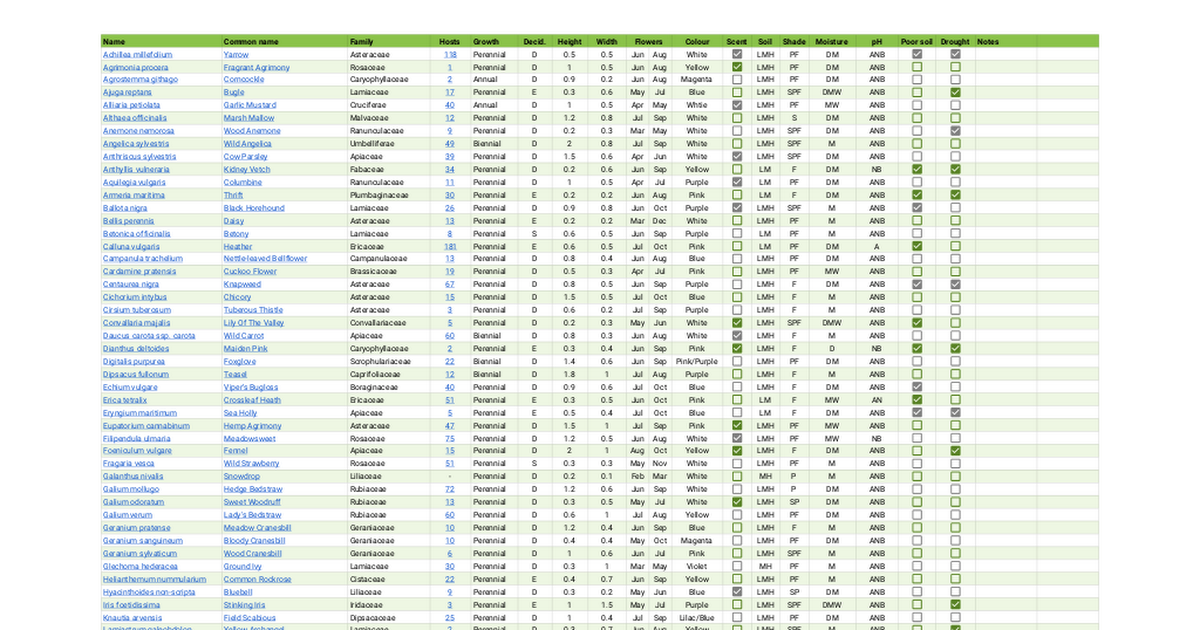 Spreadsheet of UK native wild flowers. Work-in-progress, plans to include grasses, shrubs & trees.